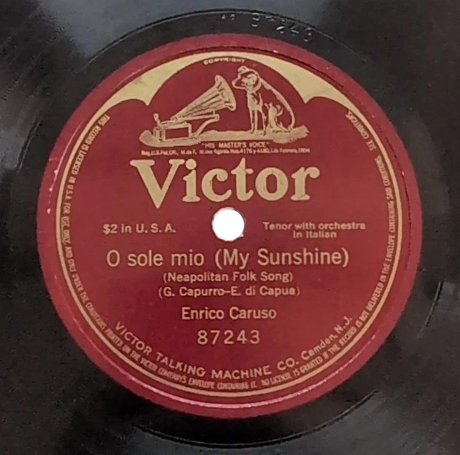 'O sole mio (par. Giovanni Capurro / mus. Eduardo Di Capua) Enrico Caruso et Orchestre dir. Walter B. Rogers Victor 87243, mat. B-17124, enr. à Camden, New Jersey, le 05 février 1916 (a) réenregistré à Camden le 15 août 1932 avec le Victor Symphony Orchestra dirigé par Nathaniel Shilkret sur Gramophone DA 1303, mat. 40 5370 (b)