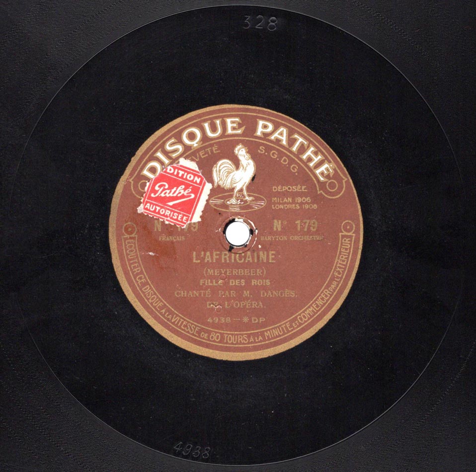 Air "Fille des rois" extrait de l'acte II de l'Africaine de Meyerbeer Henri Dangès (Nélusko) et Orchestre Pathé saphir 90 tours n° 4938, réédité sur 80 tours n° 179, enr. en 1908