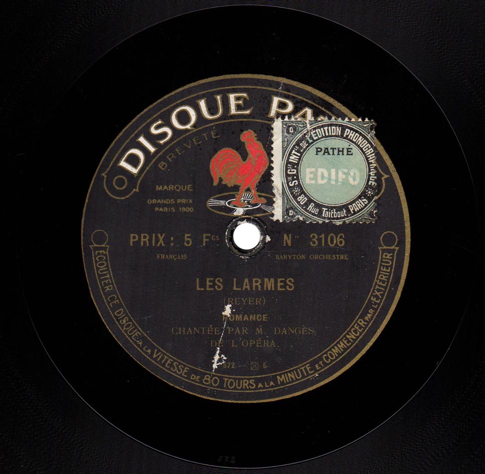 les Larmes romance (par. Camille Du Locle / mus. Ernest Reyer) Henri Dangès et Orchestre Pathé saphir 90t n° 572 réédité sur 80 tours n° 3106, enr. en 1908