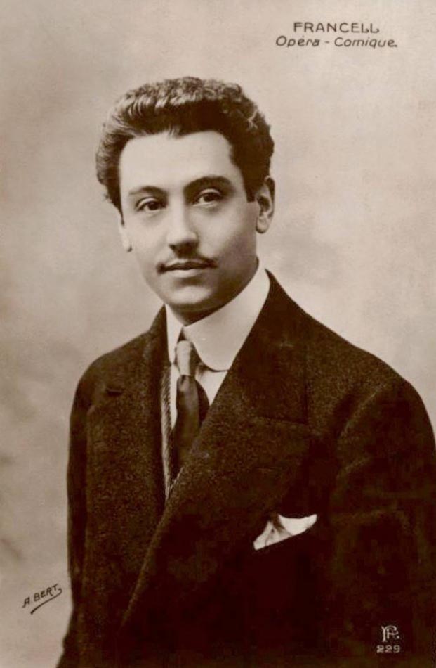 Tout jeune, M. Fernand Francell — né à Gevrey-Chambertin (Côte‑d'Or) — a l'idée de chanter. Pourtant, avant d’embrasser la carrière lyrique, il prépare l'école des Beaux-Arts. Ceux qui l'entendent interpréter à l'Eglise de la musique liturgique se rendent compte de ses qualités vocales, et c'est un professeur de chant de Dijon qui le décide définitivement à travailler en vue du Conservatoire. Il suit, alors quelques cours et, en 1903, il est admis au Conservatoire de Paris dans la classe de Mme Rose Caron. En 1906, il obtient un premier prix d'opéra-comique dans Manon (2e acte) et un premier prix de chant dans Don Juan. Engagé aussitôt à l'Opéra-Comique il y débute le 11 septembre 1906 dans Mireille (Vincent). Il est distribué dans le Barbier de Séville, Mignon et, le 9 novembre 1906, il fait sa première création dans le Bonhomme Jadis et chante Madame Butterfly. Dès lors, il fait une brillante carrière à l'Opéra-Comique. Tout d'abord, il y crée Fortunio (5 juin 1907), Solange (10 mars 1909), Chiquito (30 octobre 1909), le Mariage de Télémaque (4 mai 1010), le Voile du Bonheur (1911), la Danseuse de Pompéi (29 octobre 1912), Francesca de Rimini et la Vie brève (décembre 1913), la Marchande d'Allumettes (1914). En dehors de ces créations pendant ces huit années, il est affiché dans un grand nombre d'ouvrages du répertoire : la Traviata, la Basoche, la Vie de Bohème, Lakmé, la Habanera, Phryné, la Reine Fiammette, la Dame Blanche, le Jongleur de Notre-Dame, Manon, Carmen, Pelléas et Mélisande, le Déserteur, Fra Diavolo, les Contes d'Hoffmann, Don Juan. Mobilisé pendant la guerre, il rentre à l'Opéra-Comique en 1919, où il chante son répertoire, auquel il ajoute Mârouf savetier du Caire, Sapho, et, en octobre 1919, il signe avec la Gaîté pour chanter la Belle Hélène. Revenu à l'Opéra-Comique, il y fait un séjour de quelques mois et il part pour une grande tournée Sud-Américaine. De retour en France, c'est à Bordeaux qu'il est engagé en 1921, y interprétant, entre autres pièces, Orphée, de Gluck. En juin 1921, il repart en Amérique du Sud, et revient en octobre pour donner quelques représentations à l'Opéra-Comique. En 1922 au théâtre Mogador il crée Monsieur l'Amour. (Nos vedettes, 1922)