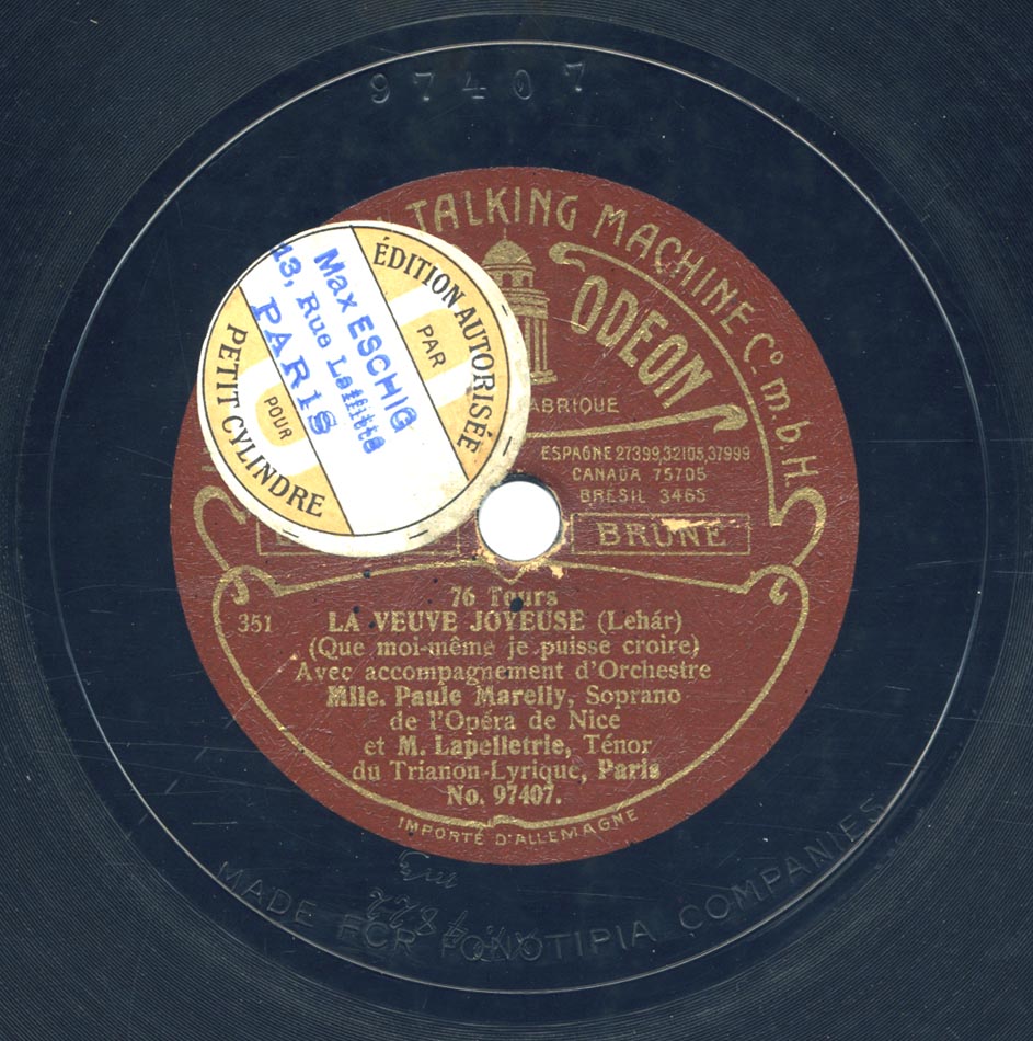 "Que moi-même je puisse croire" extrait de la Veuve joyeuse de Lehár [v. fr. de Flers et Caillavet] Paule Marelly, René Lapelletrie et Orchestre Odéon 97407, mat. XP 4822, enr. en mai 1909