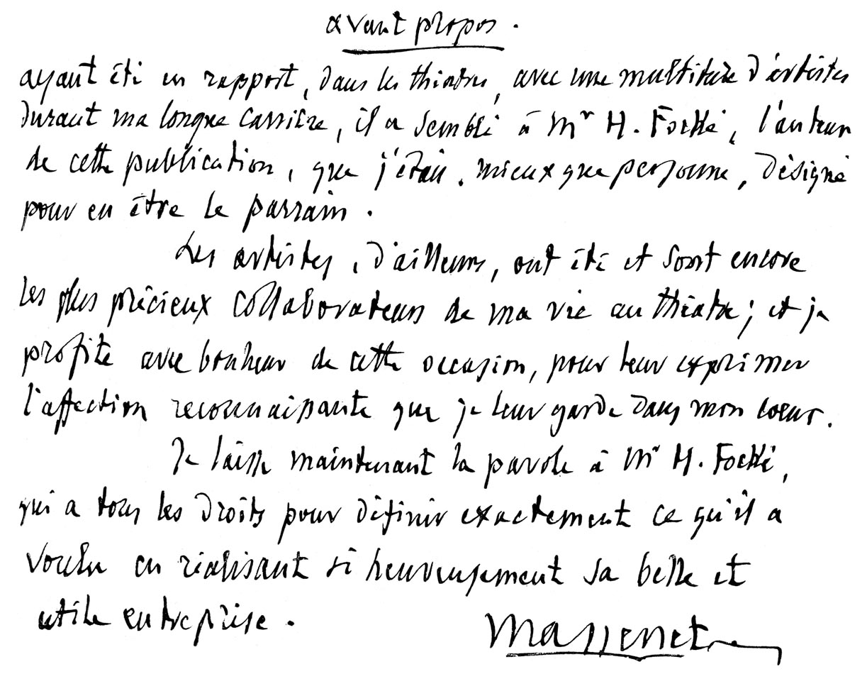 avant-propos de Jules Massenet pour les Célébrités de l'art lyrique d'Henri Focké (édité en 1914)