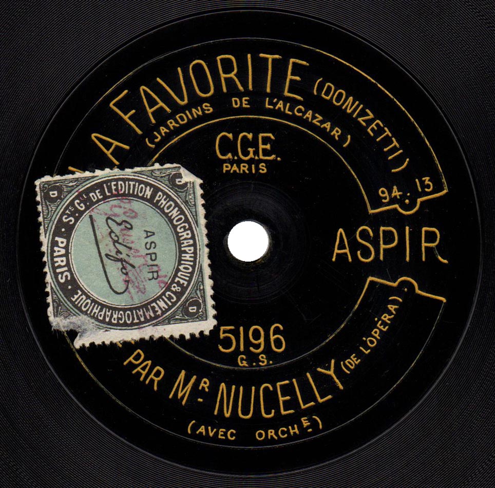 "Jardins de l'Alcazar" extrait de l'acte II de la Favorite de Donizetti Louis Nucelly (le Roi) et Orchestre Aspir 5196, mat. 9413, enr. vers 1912