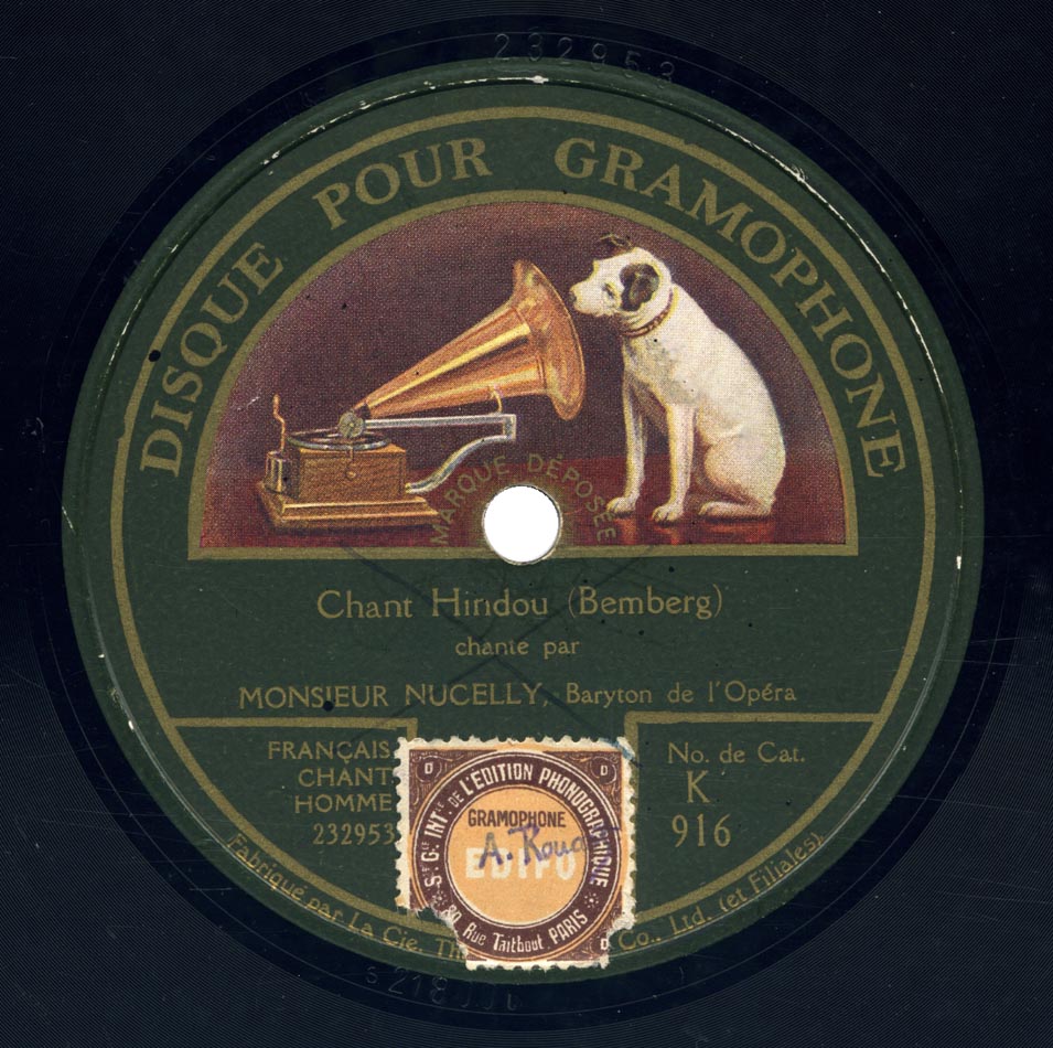 Chant hindou (mus. Herman Bemberg) Louis Nucelly et Orchestre Disque Pour Gramophone K 916 [232.953], mat. 21800, enr. le 23 novembre 1920