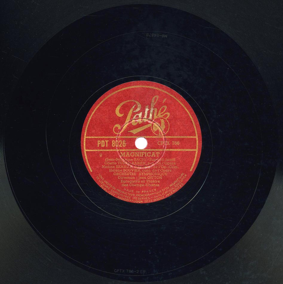 "Quia respexit" extrait du Magnificat de Jean-Sébastien Bach Odette Turba-Rabier, M. François (hautbois d'amour) et Orchestre Symphonique dir Jean Gitton Pathé PDT 8025, mat. CPTX 776, enr. au Théâtre des Champs-Elysées le 23 février 1948